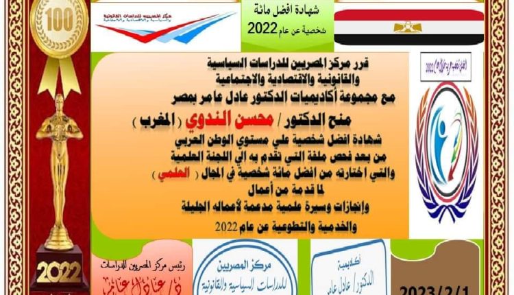 منح مركز المصريين للدراسات السياسية والقانونية والاقتصادية والاجتماعية مع مجموعة أكاديميات الدكتور عادل عامر بمصر الدكتور محسن الندوي رئيس المركز المغربي للدراسات الاستراتيجية والعلاقات الدولية شهادة افضل شخصية على مستوى الوطن العربي