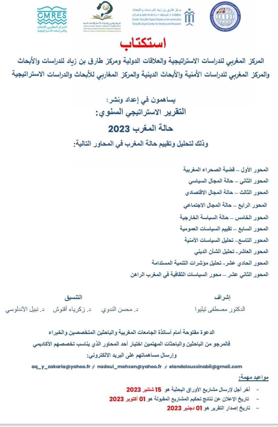 تقاريروطنية استكتاب حول التقرير الاستراتيجي السنوي : حالة المغرب 2023 بواسطة admin آخر تحديث فبراير 16, 2023 0 شارك 0 شارك FacebookTwitterGoogle+ReddItWhatsAppPinterestالبريد الإلكتروني