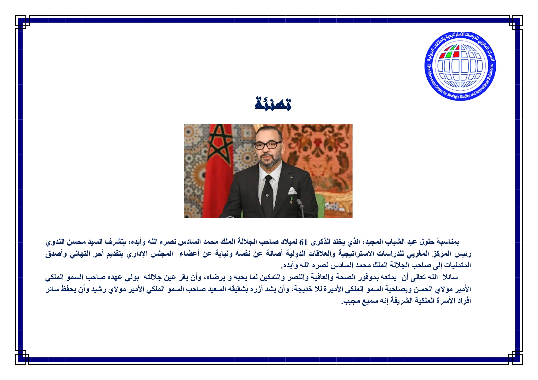 تقاريروطنية تهنئة المركز المغربي للدراسات الاستراتيجية والعلاقات الدولية بعيد ميلاد الملك محمد السادس نصره الله وايده بواسطة admin في أغسطس 21, 2024 0 شارك 0 شارك FacebookTwitterGoogle+ReddItWhatsAppPinterestالبريد الإلكتروني