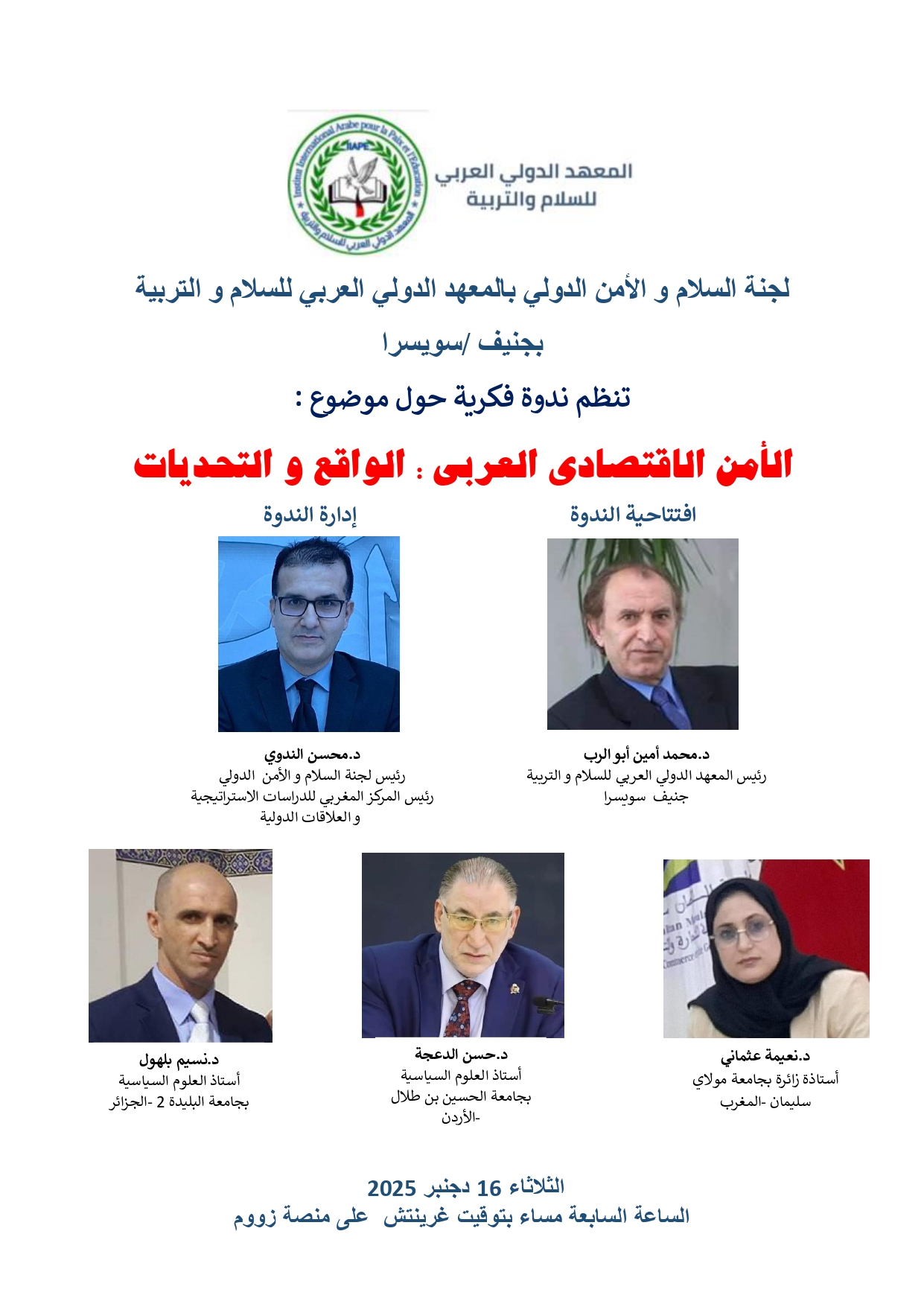 نظمت لجنة السلام والأمن الدولي التابعة للمعهد الدولي العربي للسلام والتربية، ذي الصفة الاستشارية في الأمم المتحدة، ندوة فكرية عن بعد تحت عنوان “الأمن الاقتصادي العربي: الواقع والتحديات”، وذلك يوم الثلاثاء 16 دجنبر 2025 ، تناولت أبرز قضايا السلام والأمن في الوطن العربي، مع التركيز على البعد الاقتصادي في ظل التحولات الدولية والإقليمية المتسارعة. وتأتي هذه الندوة في إطار رؤية فكرية تسعى لتعميق النقاش العلمي الرصين حول بناء الأمن الاقتصادي ضمن إطار العمل العربي المشترك، وتشكل جزءًا من سلسلة مبادرات أكاديمية تهدف إلى تعزيز المقاربة العلمية في معالجة قضايا الأمن الشامل.